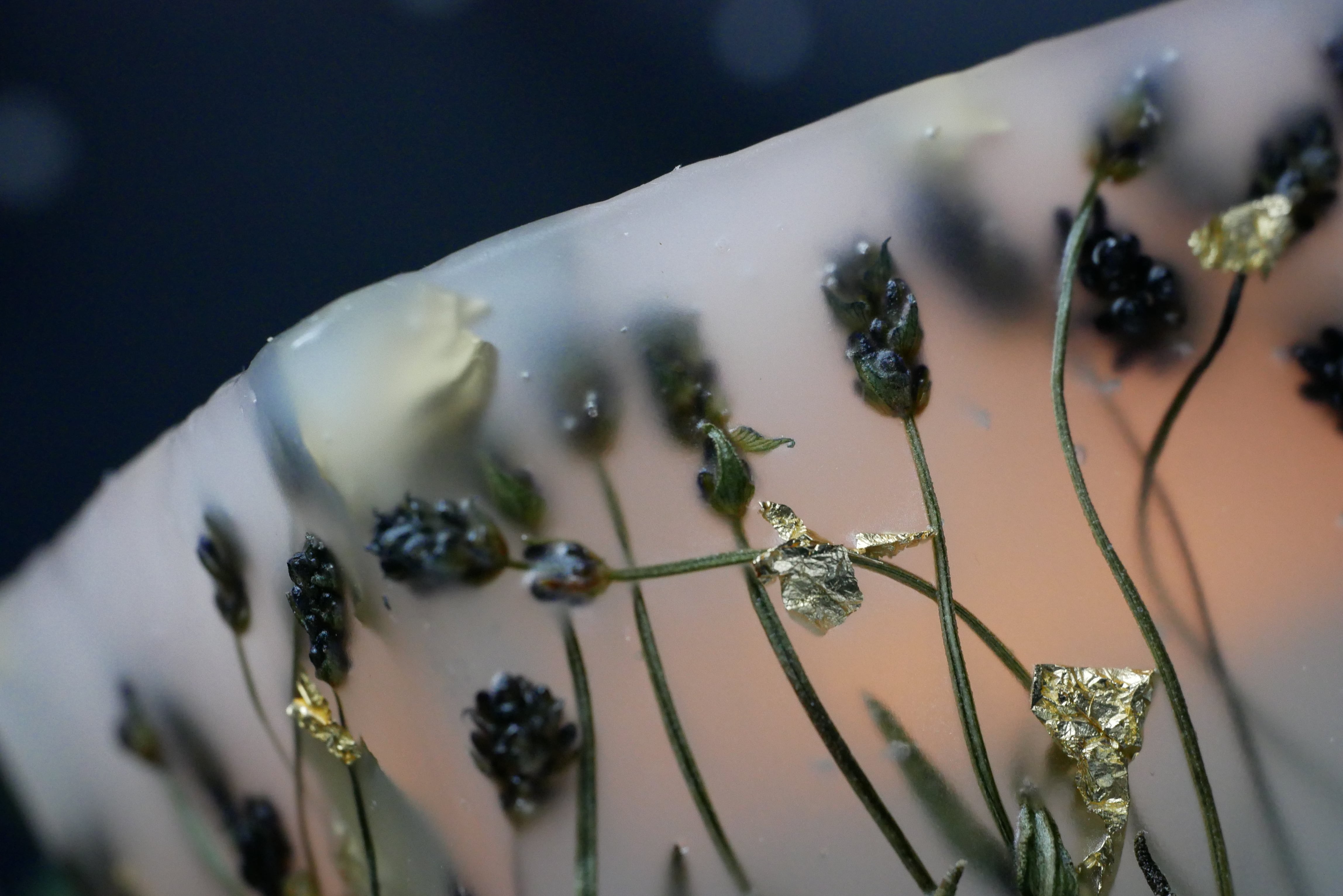 私のお庭で咲いたお花を押し花やドライフラワーに加工した後にパラフィンワックスで閉じ込めました。